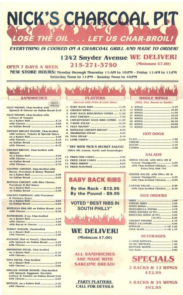 Welcome to Nick's Charcoal Pit, a culinary gem nestled in Philadelphia, PA. This steakhouse specializes in mouthwatering dishes that celebrate bold flavors and quality ingredients. The menu features delightful seafood platters, including the Maryland Style Shrimp Platter and expertly charbroiled salmon steaks, both showcasing a harmonious blend of spices and marinades.